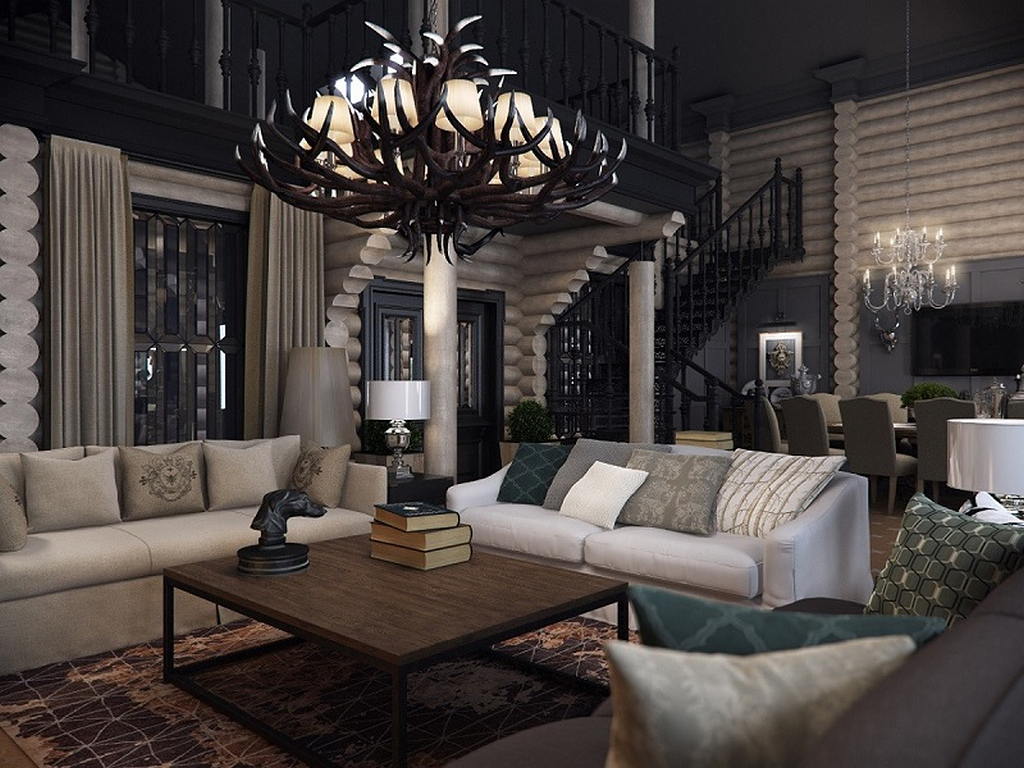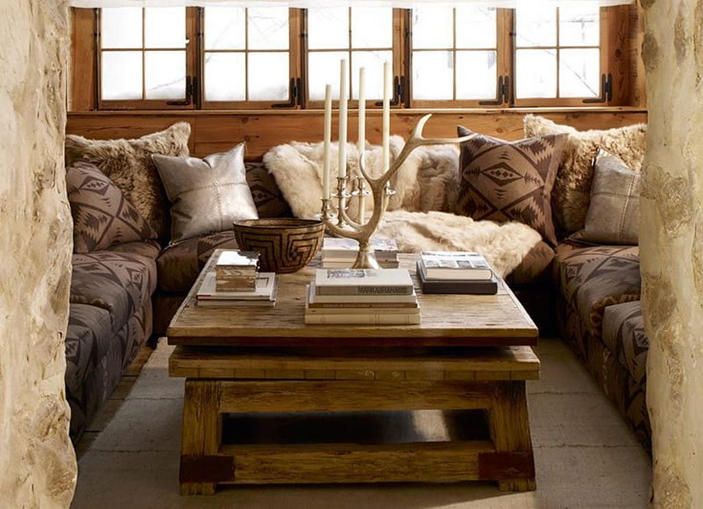 Мебель в основном используется как можно больших размеров и из грубого текстиля или из кожи. Прекрасным дополнением послужат накидки на диван и кресла из шерсти или натурального меха.