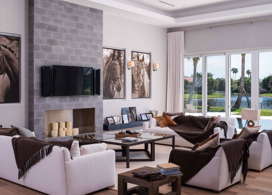 Камин — визитная карточка стиля, место фокусировки интерьера. Он устанавливается в гостиной, а то и в спальне, облицовывается камнем. Встречаются электрические камины, над которыми вполне естественно выглядят плазменные телевизоры.