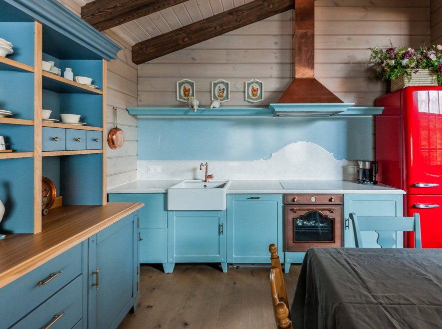 Этот стиль находится вне моды, обеспечивая популярность нарочитой сельской романтики в самых разных странах. При необходимости опытные дизайнеры могут внести в общий формат нотки современности. При этом уютная атмосфера альпийских домиков абсолютно не нарушается. Современная бытовая техника, новейшее оборудование для дома маскируется посредством специально оборудованных шкафчиков, ниш, консолей. Холодильник и микроволновую печь для кухни стоит подбирать с металлическими поверхностями, со стальными и серебряными расцветками.