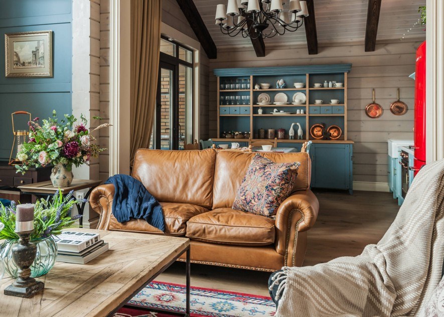 Мебель деревянная, добротная, удобная. В стиль впишутся предметы внушительного вида, мягкие, но имеющие грубоватый вид, с потертостями. Украшением гостиной станет большой кожаный диван с подушками и пледами.