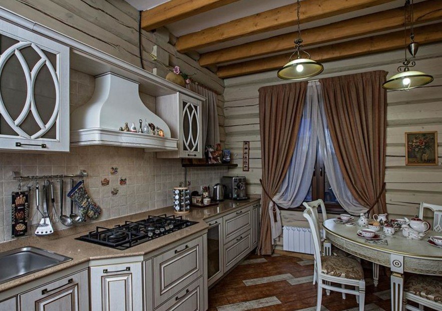 Используемый текстиль должен иметь плотную структуру. Часто используются шерстяные ткани. На полу уместны ковровые или войлочные покрытия, которые не только создают уют, но и утепляют помещение. Украсят кухню тканевые накидки на сиденья стульев, льняные или конопляные скатерти.