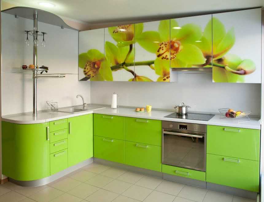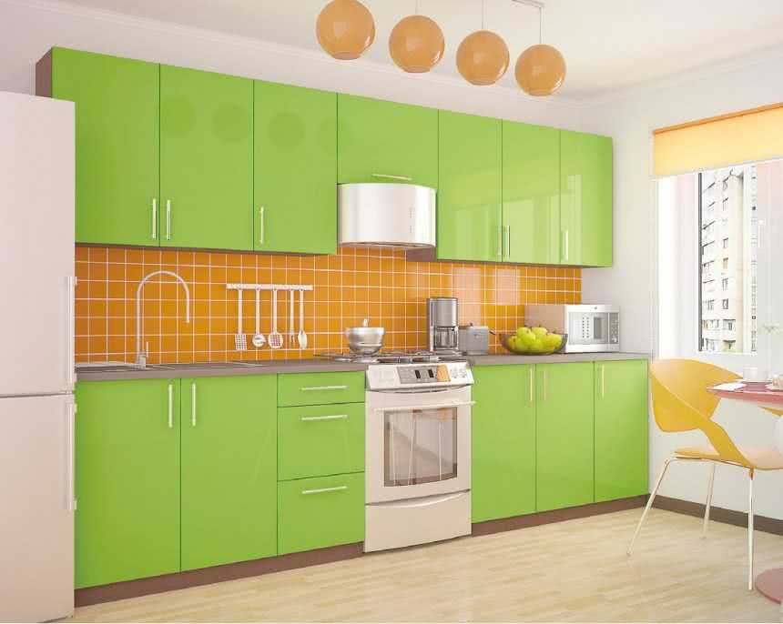 Чтобы обустроить такой интерьер, достаточно установить на кухне современный гарнитур из пластика с фасадами зеленого цвета.