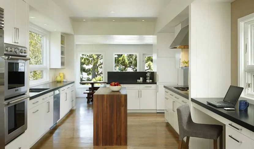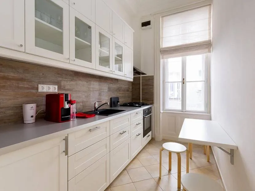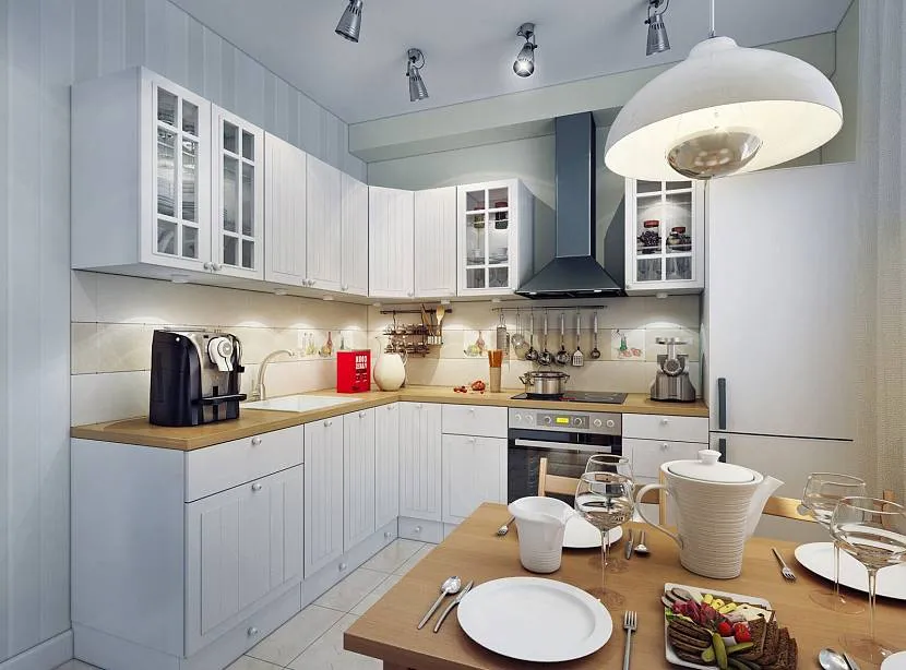 Этот стиль идеально подойдёт для небольшой, узкой кухни как с точки зрения практичности, так и по эстетическим соображениям. Начать следует с зоны для приготовления пищи. Здесь следует использовать не слишком широкие кухонные столы, отказаться от полноценной газовой плиты, использовать двухконфорочную варочную поверхность, поставить небольшую мойку для посуды. Всё это позволит освободить дополнительное пространство, которое позволит свободно передвигаться по помещению, не мешая друг другу.