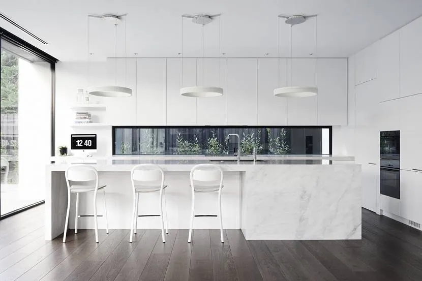Кухня должна быть максимально лаконичной, светлой и просторной. Рекомендуется использовать в отделке такие материалы, как керамогранит, искусственный камень, стекло, хромированные металлические поверхности, ламинированные панели из ДСП, пластик.