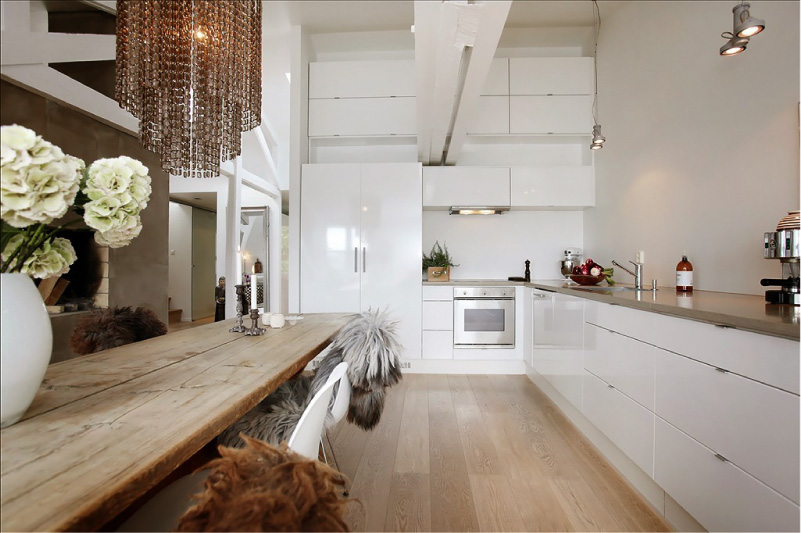 Комбинация белого цвета и дерева натурального оттенка очень приятна глазу, а еще она универсальна, а главное — просто создана для реальной жизни. Неспроста белая кухня с деревянной столешницей и полом является одной из самых популярных во всем мире.