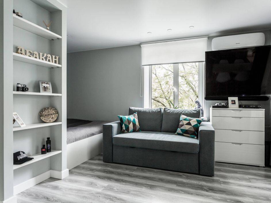 Для размещения всего необходимого в маленькой квартире следует совместить зоны с разными функциями. Обычно комбинируют гостиную и спальную зону.