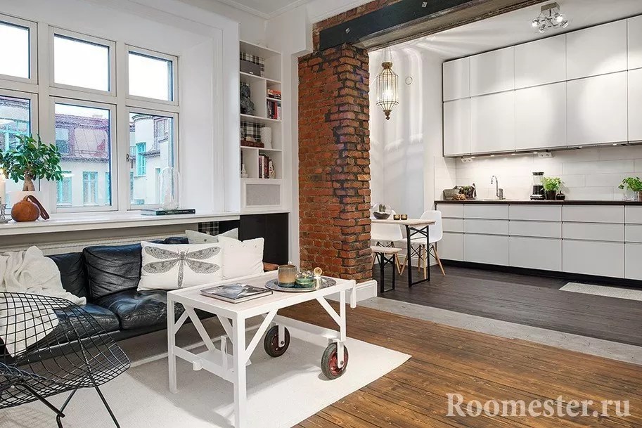 Между комнатами отсутствуют перегородки, а жилье делится на функциональные зоны.