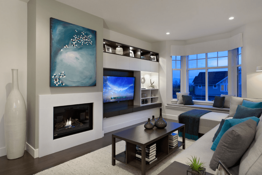 - В-четвертых, камин следует расположить в углу (если интерьер современный, то домашний кинотеатр лучше скрыть нишей);