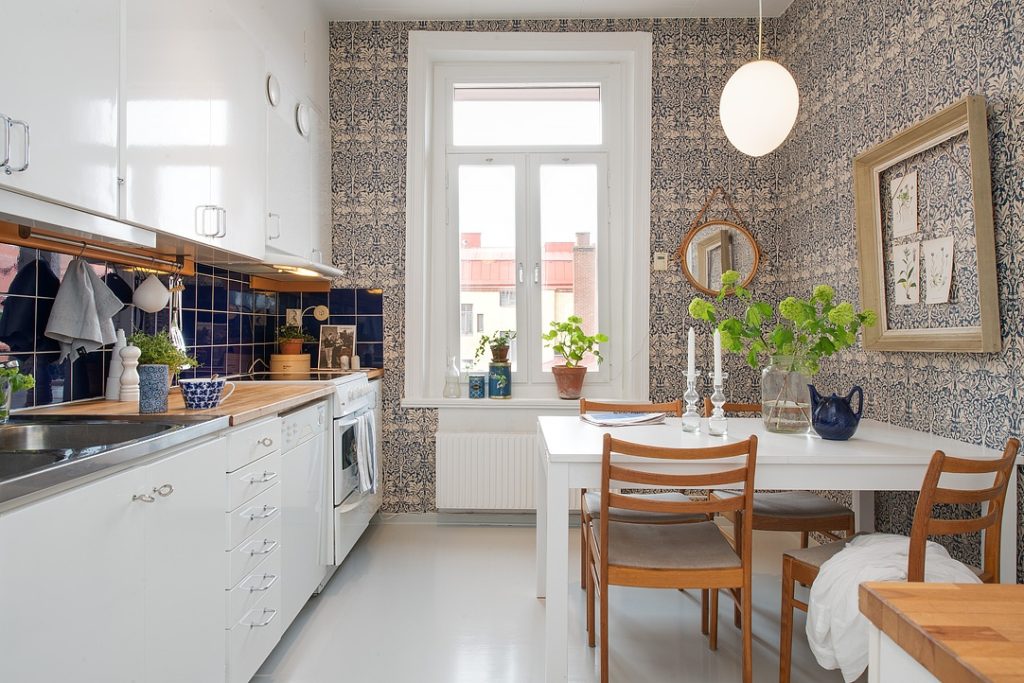 Стены в маленьком кухне лучше покрасить в светлых тонах. Если оклеить обоями, то с максимально простым рисунком.