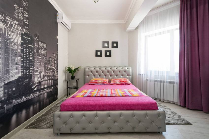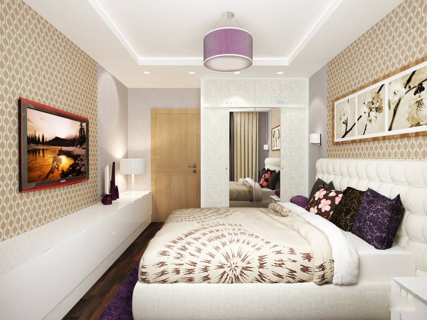 Кровать размещается по центру, у изголовья одной из стен, гардероб устанавливается у глухой стены.