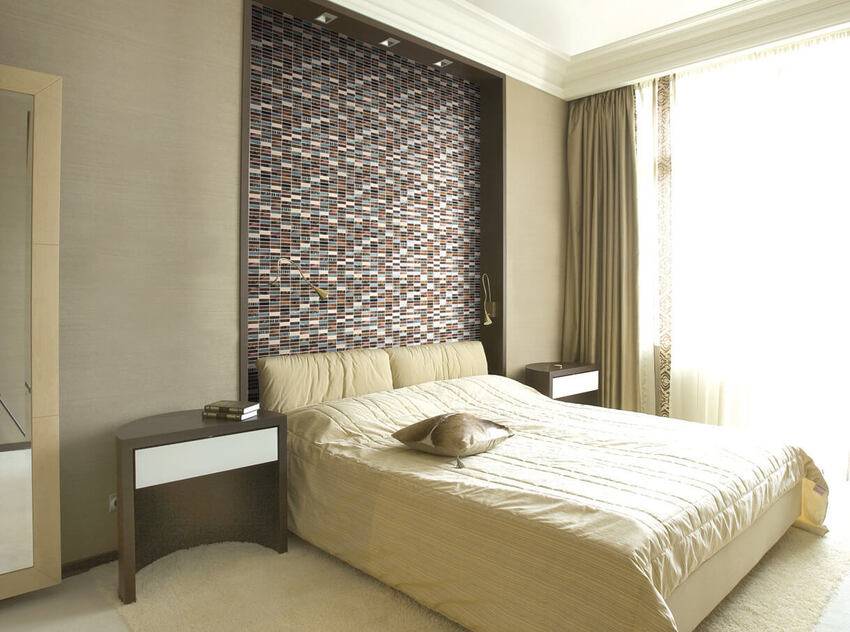 Камень или плитка эффектно выглядят, однако не рекомендуются для отделки в небольших спальнях, так как они делают комнату более строгой и холодной.