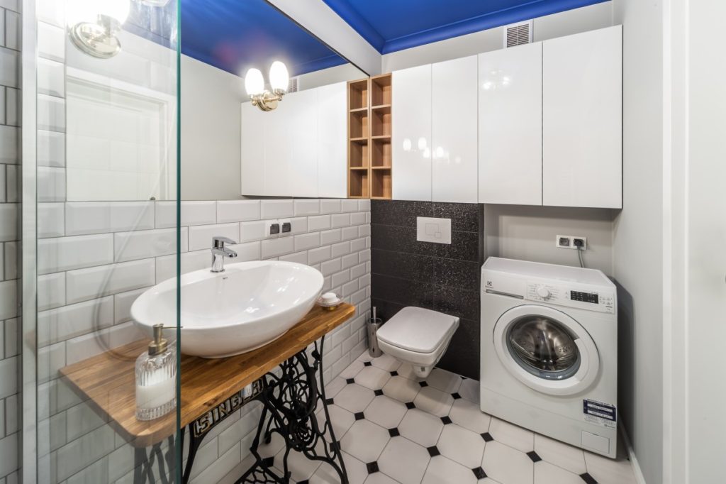 Потому при расположении стиральной машины в ванной необходимо позаботиться, чтобы даже в самой маленькой комнате были комфортные и безопасные подходы ко всей технике. Сегодня в интернете не проблема найти массу фотографий с креативными вариантами расположения стиральной машины в ванной. С одной стороны, это замечательно, ведь благодаря им можно в своей квартире попробовать расставить сантехнику и мебель подобным образом. Но с другой стороны: насколько предлагаемые идеи размещения стиральной машины в ванной безопасны?