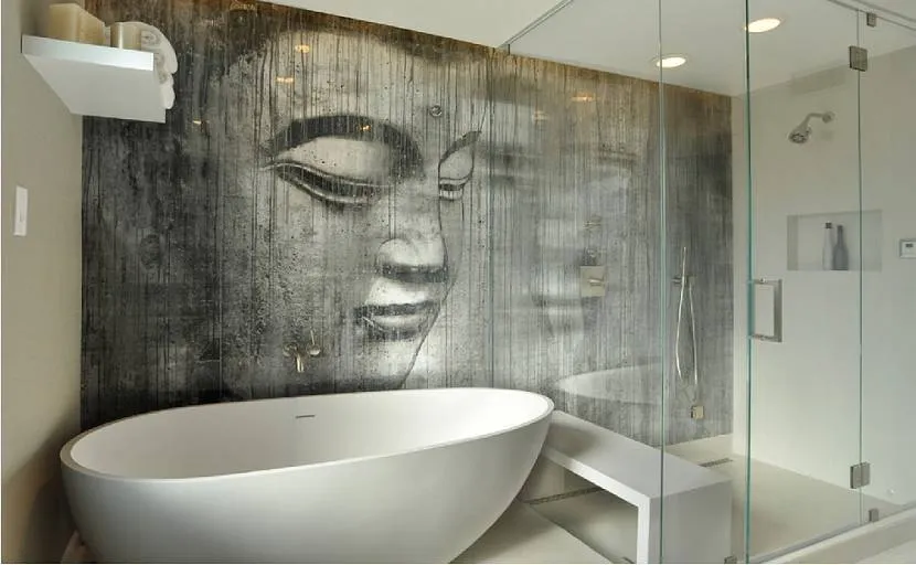 Для отделки стен рекомендуется использовать сплошные отражающие покрытия или глянцевую керамическую плитку маленького размера. Идеальный вариант – мозаика, мелкие элементы визуально увеличат объем и расширят узкое помещение. Светло-серые и голубые оттенки зрительно отдаляют пространство и слегка отодвигают стены. Если хочется чего-то необычного, то стоит присмотреться к новинке – плитке с фотопечатью. Объемные изображения, уводящие взгляд вдаль, – идеальный выбор для владельцев малогабаритных ванных комнат.
