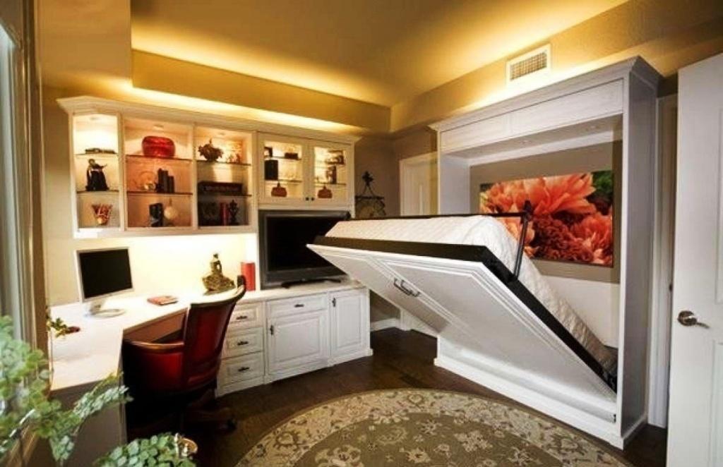 - Рабочий стол. Особы трансформеры превращают спальное место в рабочий стол: кровать в разложенном виде находится над столом, а, когда кровать скалывается, механизм поднимает стол на нужный уровень.