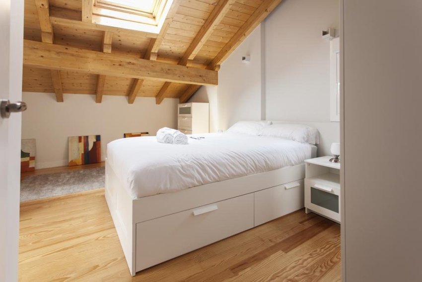 Натуральные материалы и холодные оттенки в интерьере вместе с использованием мебели из светлой древесины позволят добиться эффекта расширения пространства. Это направление предполагает монохромное оформление без декора, где важно подобрать подходящий текстиль на кровать и для обивки мебели.