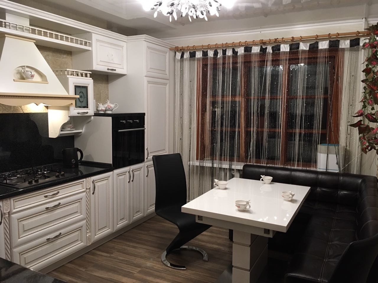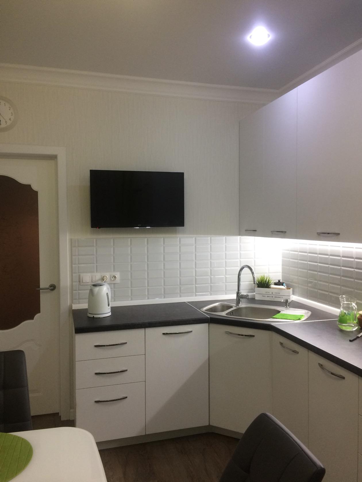 Например, фон кухни формируется из двух цветов: белого и черного, матового и глянцевого. В данном случае, к белому матовому гарнитуру подбирается черный глянцевый фартук. При этом выполняется в белом цвете потолок, а стены и пол выполняются в темном цвете.