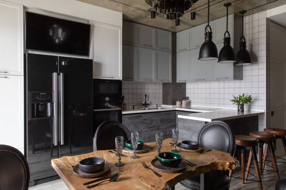 На кухне в стиле лофт уместна клинкерная плитка с имитацией кирпича. В отличие от пористого материала из глины, она долговечна и не боится влаги.