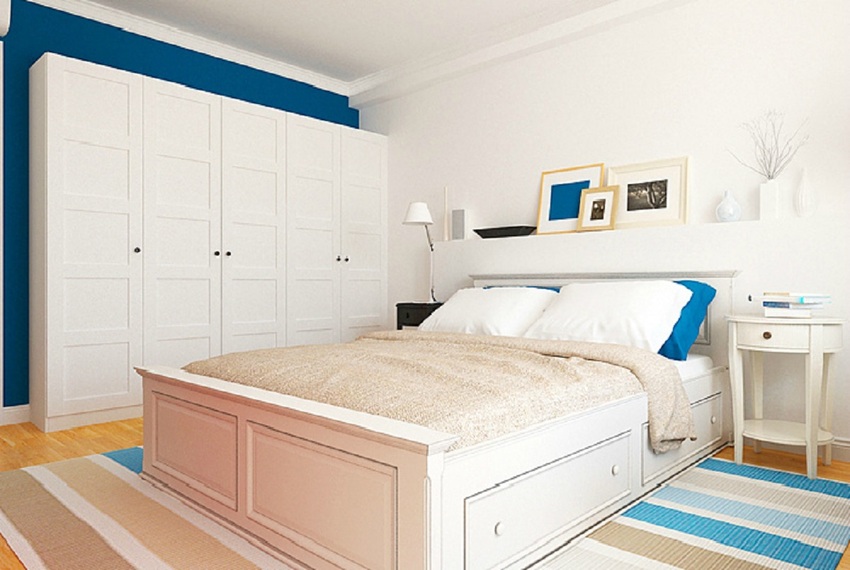 Использование светлых оттенков. В этом случае и пол, и стены одновременно оформляются в светлой цветовой гамме, что позволяет сделать спальню просторной, давая ей ощущение воздуха. Для такого дизайна не следует выбирать чрезмерно массивную мебель, так как она будет загромождать пространство.