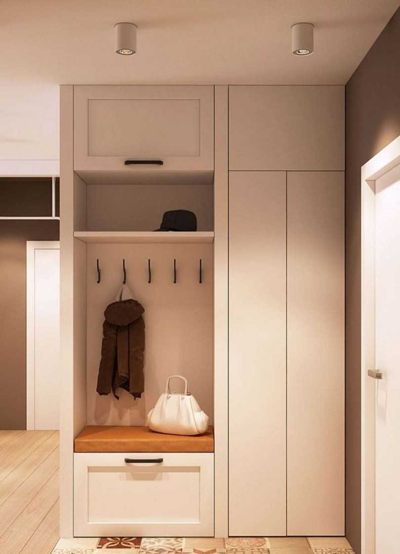 Подбирая обстановку для миниатюрного холла, стоит обратить внимание на обувницы, встроенные в шкаф