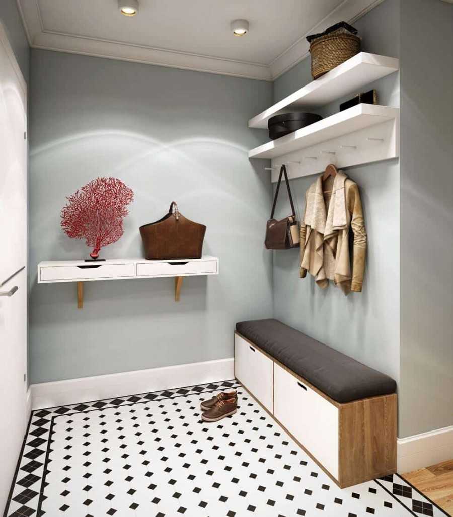 Небольшое помещение не хочется заставлять громоздкими вещами, но здесь никак не обойтись без шкафа (или вешалки), тумбочки или подставки под сумки, банкетки или пуфика.