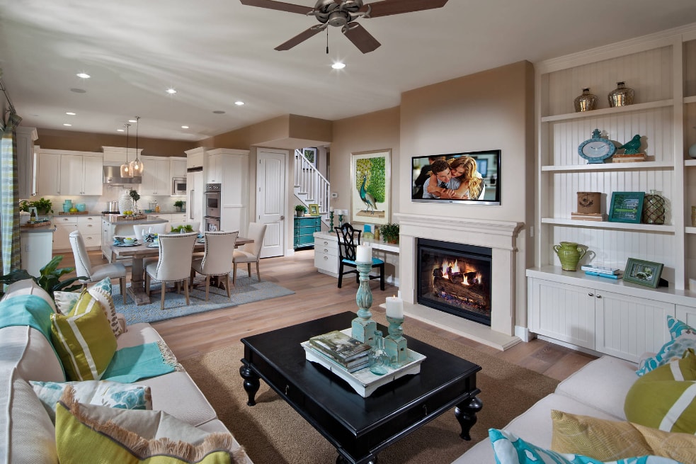 Главные «герои» гостиной в частном доме — диван или кресла. Их располагают напротив камина и/или телевизора. Кухне нужно больше света, а гостиной может подойти более приглушенное, романтическое освещение. Для создания уюта используют витражи. Они пропускают дневной свет в особом преломлении, создавая игру теней на стенах, мебели и полу.