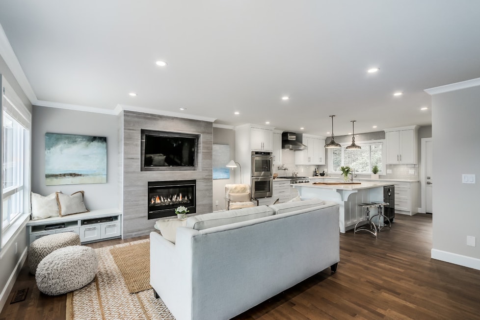 Чаще всего в загородных домах зоны разделяют печью или камином. Его можно встроить в специальный короб. Зонировать можно и фальш-стеной, встроив в нее камин или разместив его угловым способом.