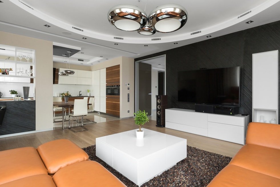 5.Освещение в кухне-гостиной должно соответствовать трем критериям – быть равномерным для всего пространства, особенно ярким – на кухне и в столовой зоне и атмосферным – в гостиной. Для последней будет как нельзя кстати натяжной потолок со светодиодной подсветкой.