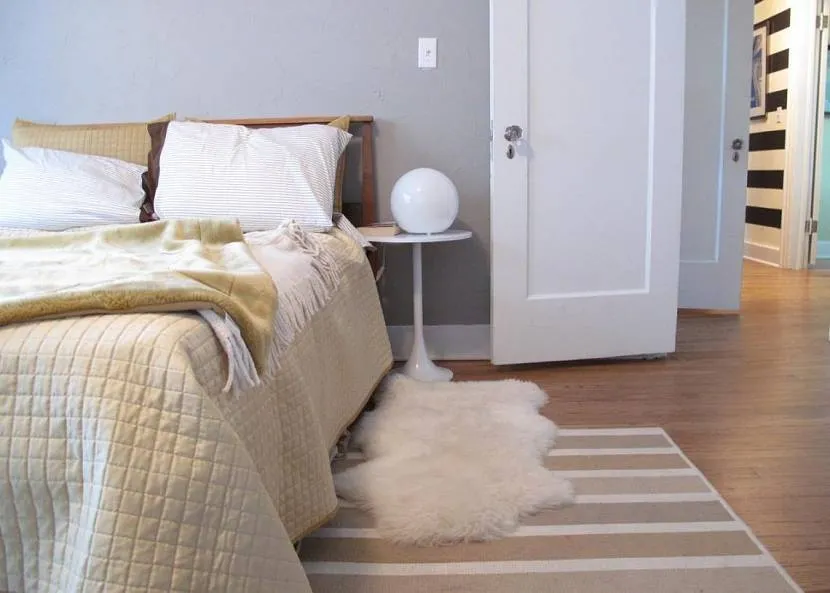 На пол можно постелить теплый ковер, тогда будет приятно вставать на него по утрам босиком и наслаждаться приятными тактильными ощущениями.
