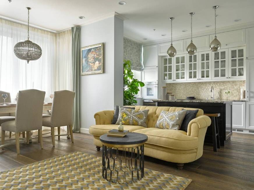 - мебельное наполнение. Используя данный вариант, можно удачно разграничить пространство кухни и зала благодаря столу или дивану. Мебель, поставленная спинкой к кухонной зоне – будет условным разграничением, но сохранит собственные функции. Стол, установленный на стыке или около стены – будет визуально делить пространство на две зоны;