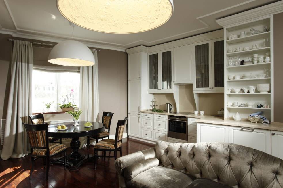 Оформление потолка чаще всего является цветовым продолжением стен, но есть и более современные варианты – комбинированные или двухуровневые потолки с ПВХ или сатиновыми полотнами. Глянцевое или фактурное покрытие гармонично дополнит кухонный гарнитур и обивку мягкой мебели в гостиной.