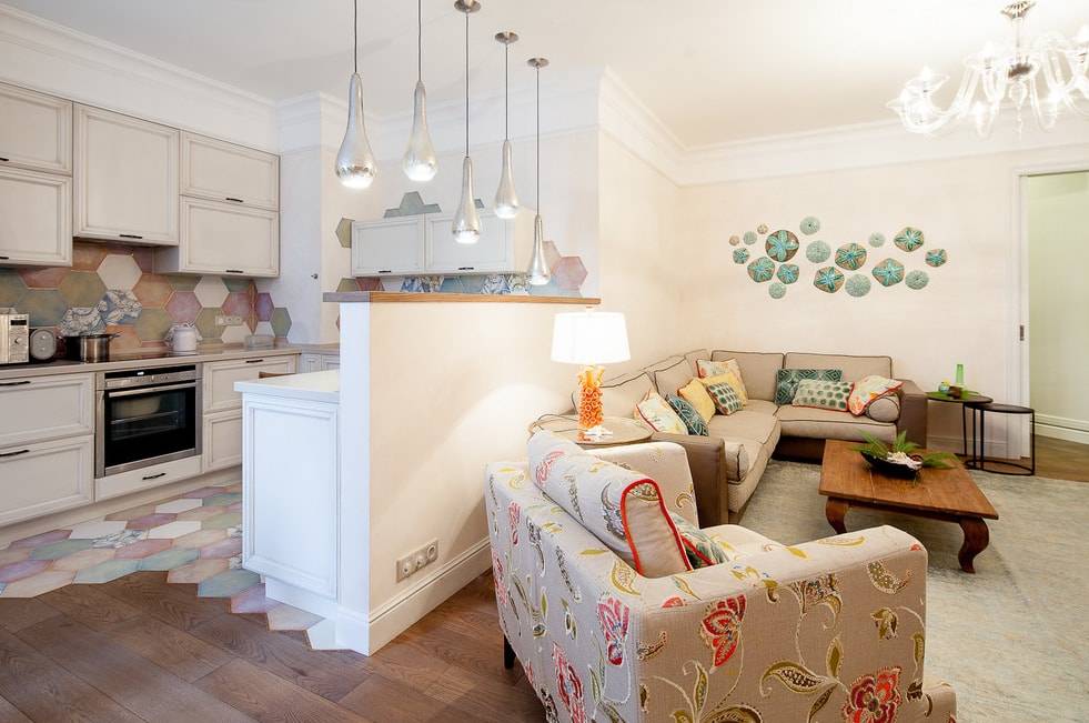 Все очень индивидуально – единого универсального решения нет. Для визуального разделения кухни, совмещенной с гостиной, используют: