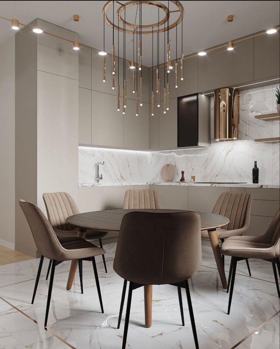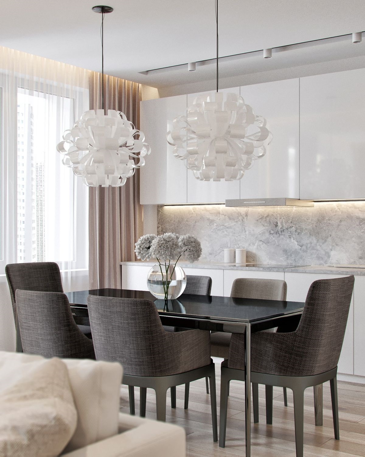 Обеденная зона освещается лампами, дающими теплый свет. При островном размещении стола, их подвешивают к потолку, если же место прилегает к стене, допустимо использовать бра, лампы на прищепках. Любые потолочные лампы рекомендуется оснащать механизмом, позволяющим регулировать их яркость, высоту расположения над столешницей. Здесь оригинально смотрятся световые потолочные балки, а напольные торшеры подойдут лишь для очень просторных комнат. Декоративная подсветка в виде светодиодной ленты «пускается» по: