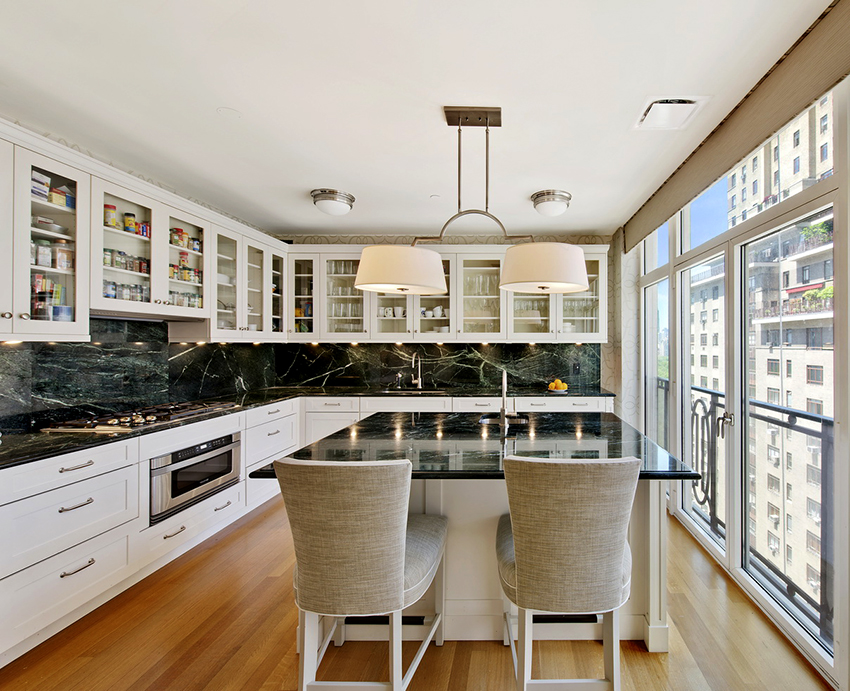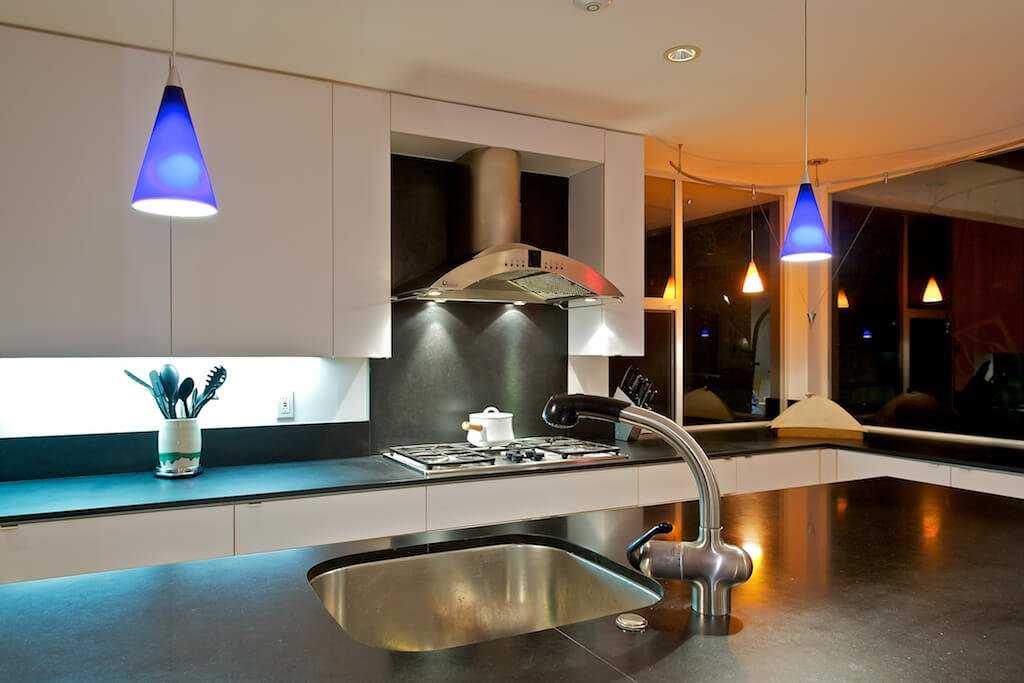 Рабочие светильники подсвечивают непосредственно зону над самой кухней. Также в интерьере могут располагаться и иные виды светильников, которые, например, могут разделять кухню на рабочую зону и, например, для отдыха.