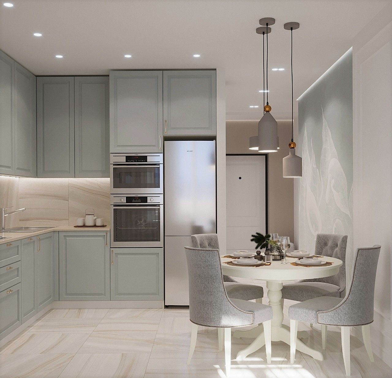 Также кухня 9 кв. метров будет отлично выглядеть в серых или грязно-голубых оттенках, особенно, если поверхности будут матовыми — как правило, кухня получается очень стильной.