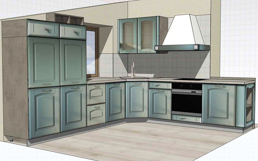 - После фиксации размеров кухни определяют, какого размера будет кухонная мебель, выбирают материалы и подсчитывают их нужное количество.