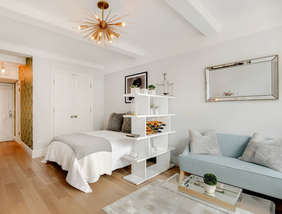 Еще одним популярным методом разделения пространства, который используется повсеместно, является применение раздвижных перегородок наподобие дверей-купе. Если перегородки сдвинуть, то квартире станет одной светлой и большой комнатой, а если разложить, то двумя миниатюрными помещениями. Это оптимальный вариант для семей с детьми.