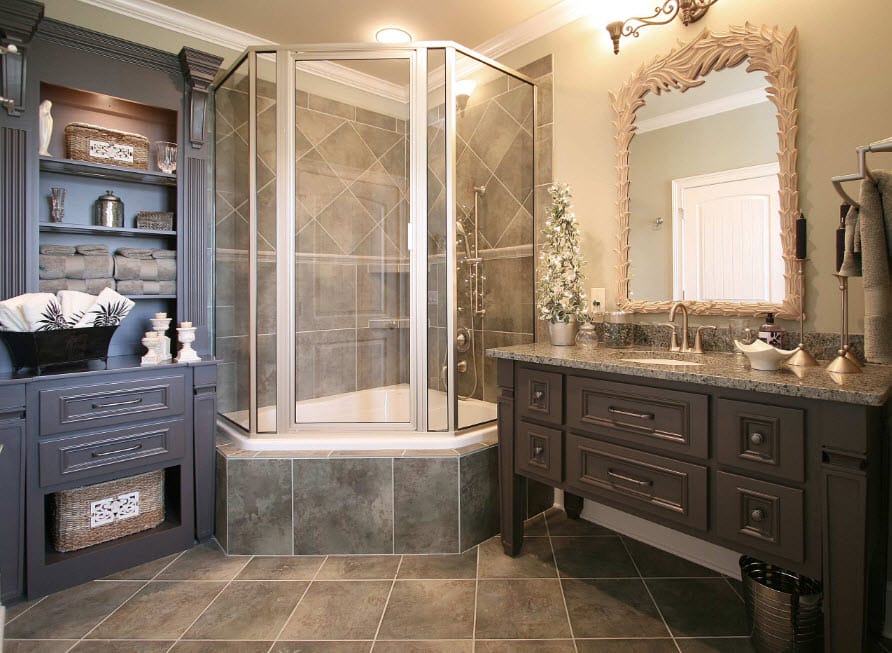 Пол оттенков графита идеально сочетается с коричневым деревом, которым можно оформить стены и сантехнику.