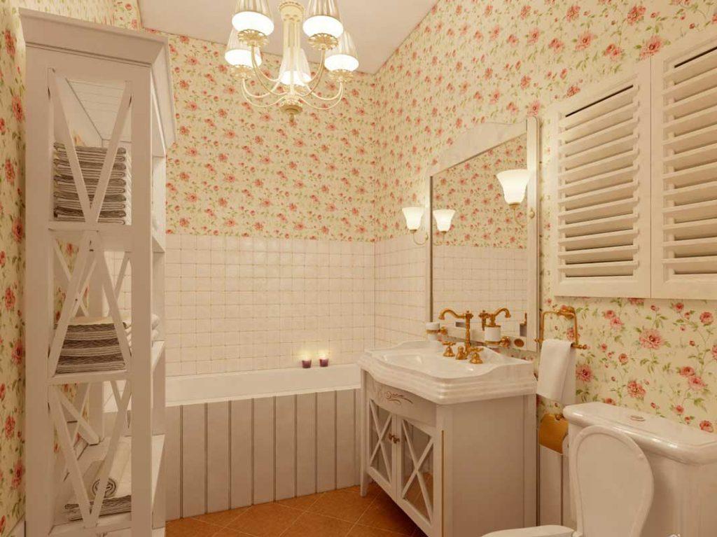 - Прованс. Гарнитур должен быть стилизован под старину. В идеале, если на створках присутствуют цветочные орнаменты, нежная роспись. С помощью деревянных створок с цветочным орнаментом можно спрятать место под ванной. Навесные шкафчики с зеркалом декорируют техникой декупажа.