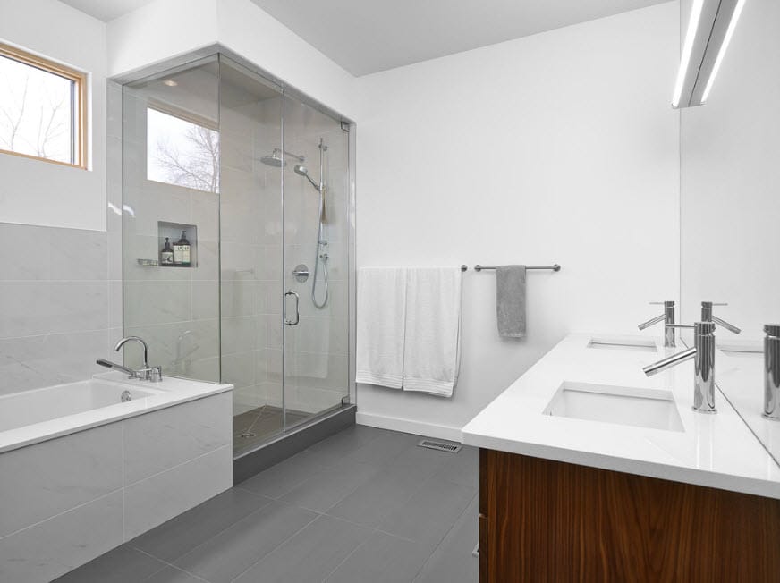 Монохромная отделка в бело-серой гамме. За счет светлых оттенков, подсветки и оконного проема, площадь выглядит просторной, несмотря на реальные габариты. Поверхность кафеля отсвечивает жемчужным блеском, расширяя тем самым визуальные границы стен.