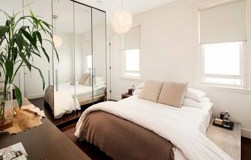 А если расположить на раздвижных дверях шкафа зеркала, то это зрительно создаст объем и раздвинет пространство. Отражающие поверхности можно разместить где угодно. Подойдет любая стена, даже за изголовьем кровати. А зеркальные потолки станут особым шиком комнаты
