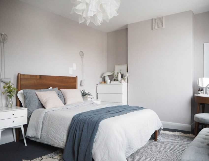 Для этого стиля интерьера характерны белые, серые и бежевые оттенки. Можно добавить несколько ярких акцентов, к примеру, цветное покрывало, ковёр или подушки.