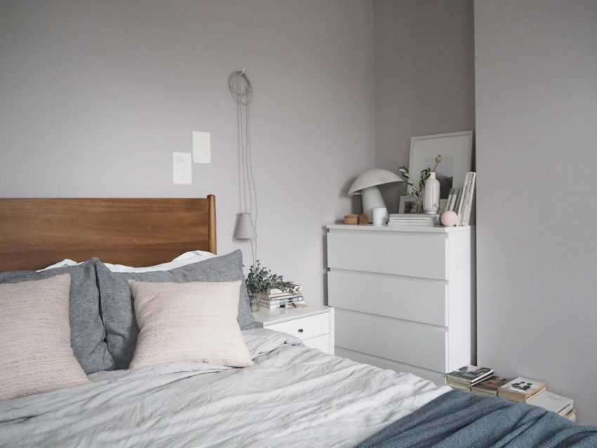 Небольшая спальня в светлом оформлении, но с темным изголовьем