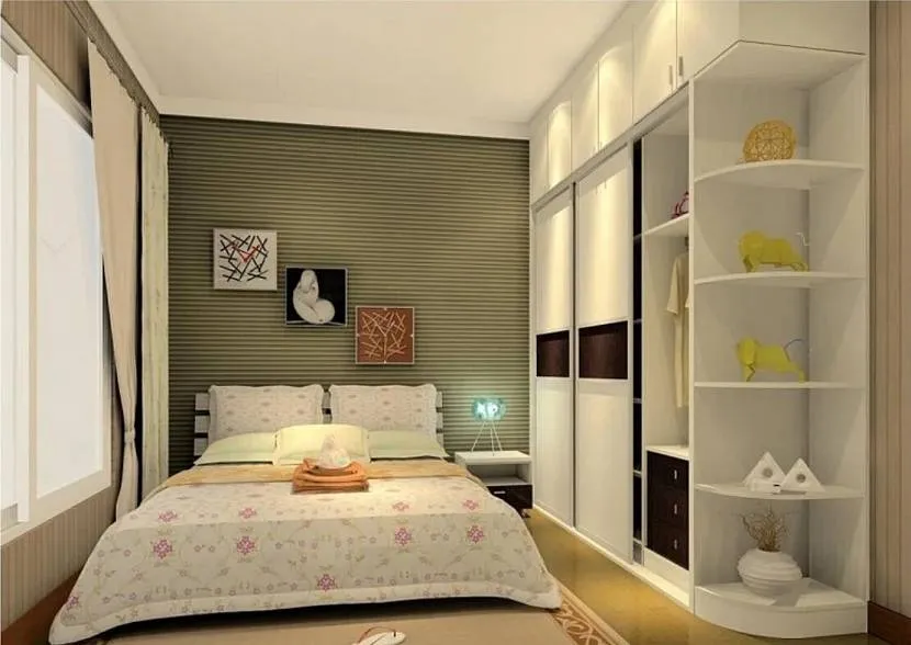 В комнате достаточно будет установить кровать-трансформер, тумбочки квадратной формы, шкаф-купе и навесные полки из пластика или металла.