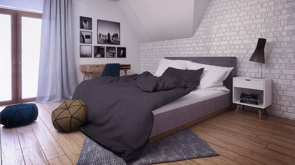 Модное нынче веяние в виде стены без отделки с «голым» кирпичом или бетоном – не слишком удачное решение для спальной комнаты. Такая деталь, включенная в интерьер спальни 12 кв, не слишком вяжется с теплотой и уютом, которые должны быть присущи этому помещению. Но даже такой дизайн удается обыграть.