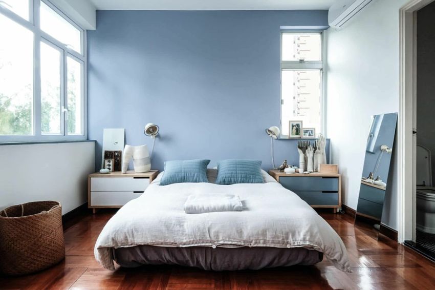 Синий цвет в интерьере спальни выглядит особенно благородно. Он не только подчеркивает эстетическую составляющую, но и часто является акцентом оформления. Кроме того, выбирая такое нетипичное решение, вы сделаете значительный вклад в собственный качественный отдых.