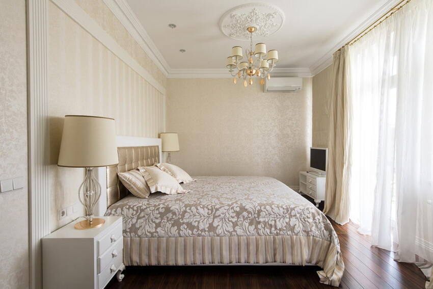 Если спальня оформлена в светлых тонах, не стоит делать пол таким же светлым, как и остальную отделку. Такой прием сформирует ощущение замкнутого пространства. Поэтому пол должен быть темнее стен и потолка на несколько тонов.