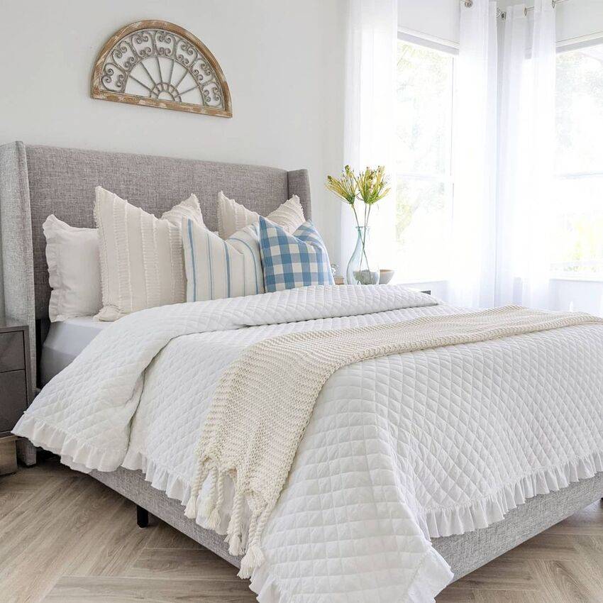 В первую очередь, рекомендуем приобрести качественный текстиль. Это могут быть пледы, декоративные подушки или что-то другое. Они имеют не только декоративное, но и практическое значение. К тому же, время от времени можно их менять на другие цветовые решения, благодаря чему интерьер спальни никогда не наскучит. Отдельно стоит отметить шторы, которые обязательно должны присутствовать в спальне. В последнее время все более актуальными становятся максимально плотные шторы, которые не пропускают солнечные лучи. Благодаря чему можно качественно отдохнуть в любое время суток.