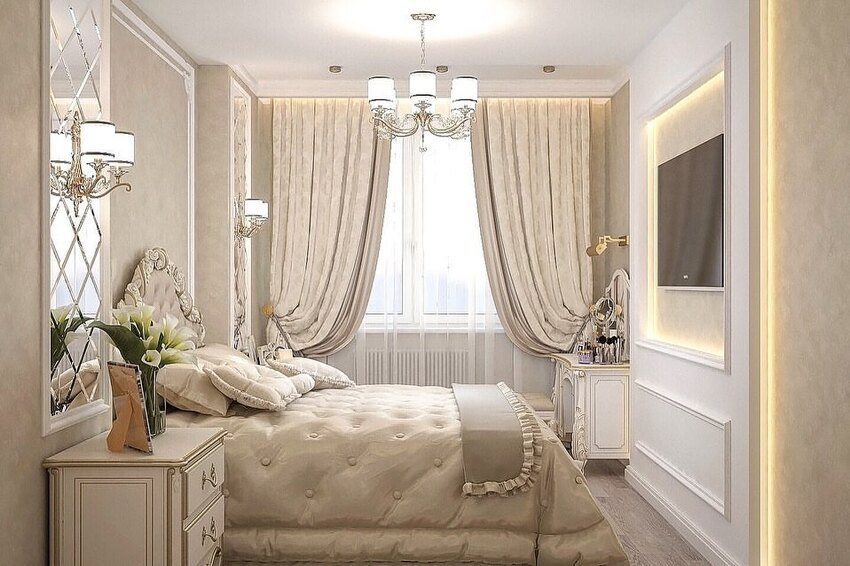 Спальня в стиле неоклассика подойдет утонченным натурам. Дорогое убранство, ненавязчивые растительные узоры и нейтральная гамма не противоречит современным веяниям, а скорее, подчеркивает их. Этим стиль отличается от классического, в который непросто вписать компьютер или телевизор, но легко обустроить камин.
