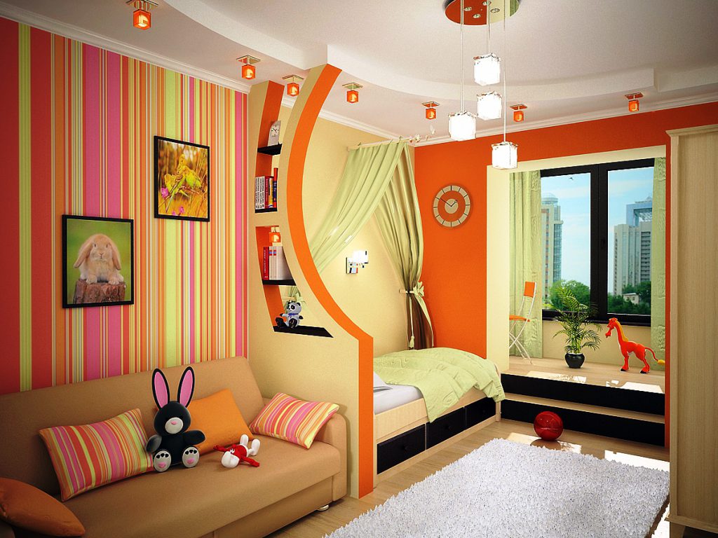 - при помощи текстиля – лаконичный балдахин над кроватью, ковер также помогут расставить акценты и выделить зоны.