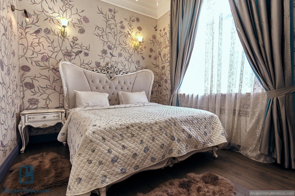 - в спальне не желательно использовать яркие насыщенные расцветки, особенно с мелком горошком, полосками, которые рябят в глазах.